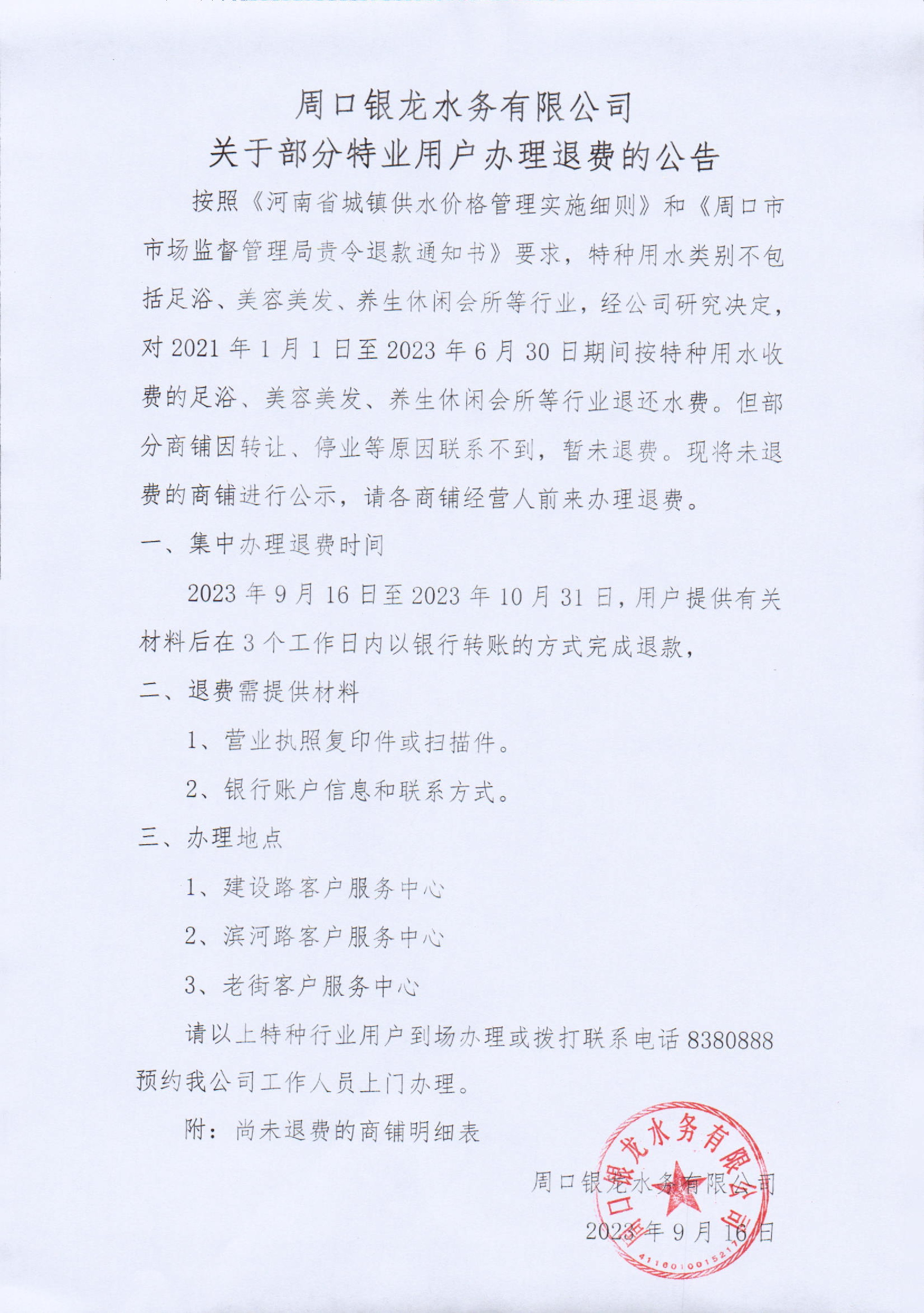 周口銀龍水務(wù)有限公司關(guān)于部分特業(yè)用戶辦理退費(fèi)的公告按照《河南省城鎮(zhèn)供水價(jià)格管理實(shí)施細(xì)則》和《周口市市場監(jiān)督管理局責(zé)令退款通知書》要求,特種用水類別不包括足浴、美容美發(fā)、養(yǎng)生休閑會(huì)所等行業(yè),經(jīng)公司研究決定...
